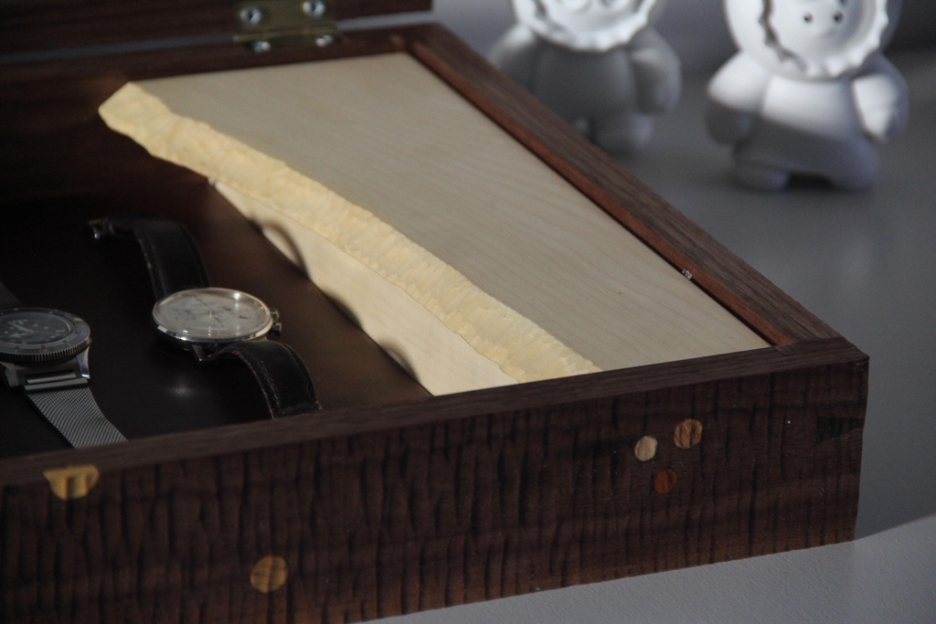 L'intérieur est muni d'un fond en cuir ou reposent les montres ainsi que d'une petite boîte en érable permettant d'y ranger les petits outils qu'il possède ou les bracelets de rechange. J'ai laissé la forme du bois du couvercle, je trouve ça très beau et ça permet à la fois de faire poignée.