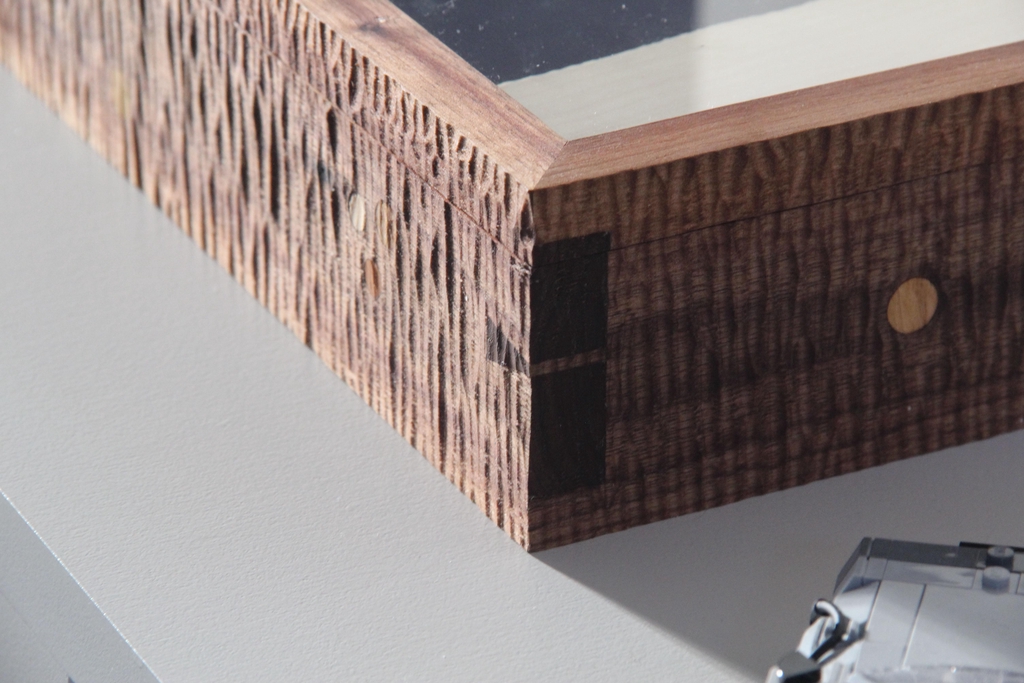 J'ai utilisé du noyer acheté récemment que je trouve magnifique. Les assemblages sont en queues d'aronde avec coupes d'onglets.
