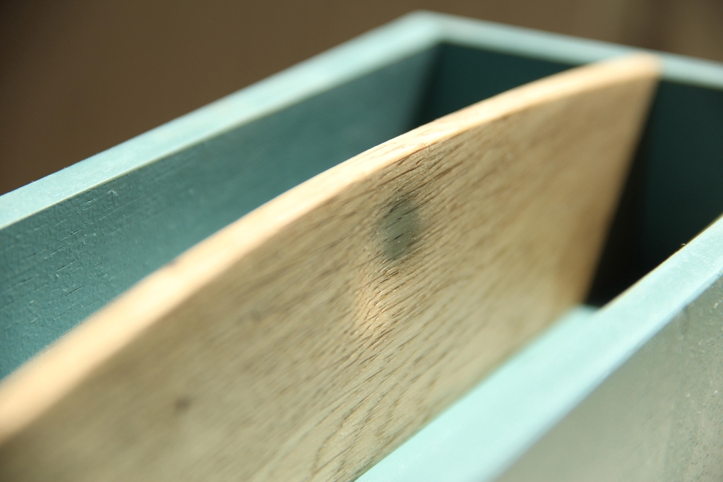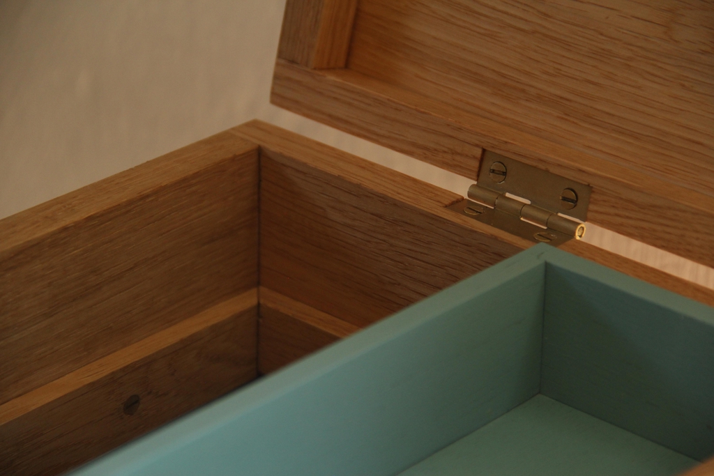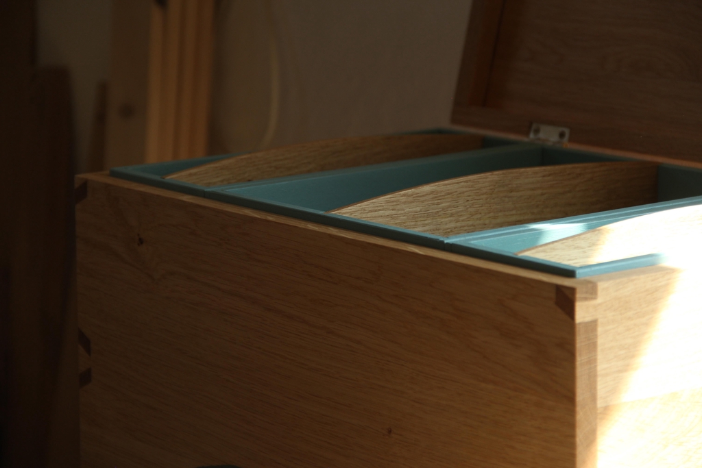 Les petits compartiments (éléments en chêne et bleu) reposent sur des baguettes fixées à l'intérieur du coffre. Ils possèdent de légers creux réalisés à la gouge pour l'indication de prise en main.