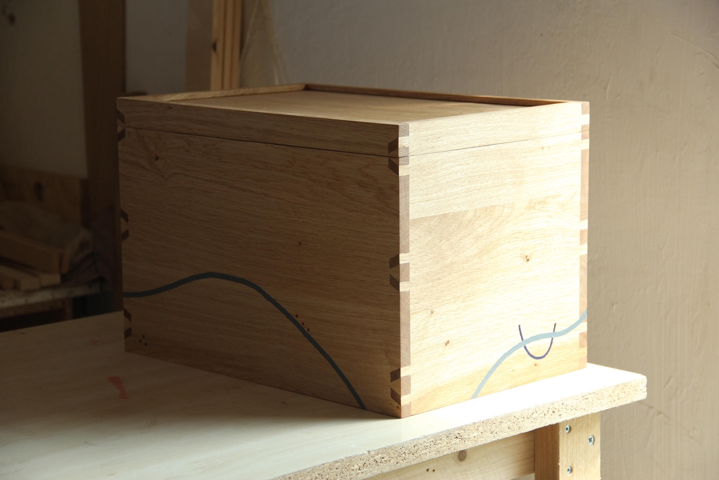 Fabrication d'un coffre en chêne huilée avec compartiments intérieurs.