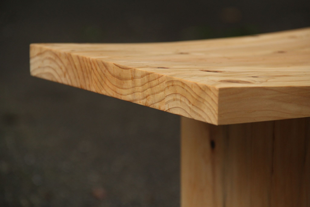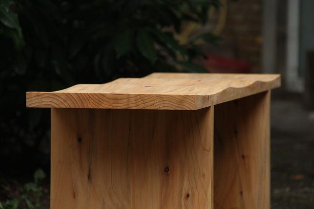 Ce banc en cèdre (d'autres essences sont possibles) a été conçu pour mettre en valeur les veinages et aspects du bois. Une "vague" présente sur l'assise dynamise l'ensemble.