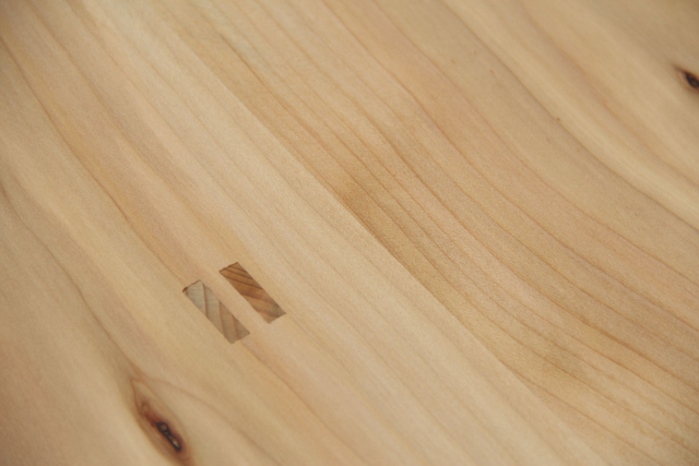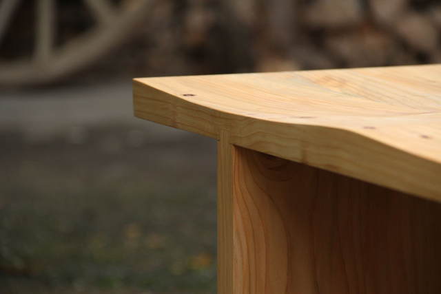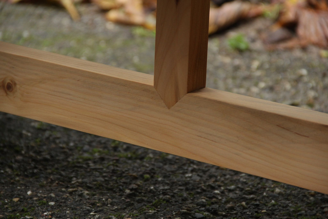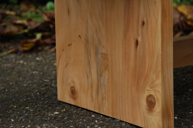 Le banc présente des assemblages classiques tels que des tenons traversants / mortaises ou des queues d'arondes. Un support au centre permet de soutenir l'assise et de renforcer le tout.