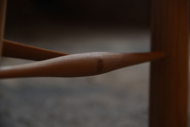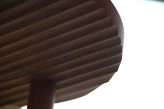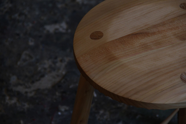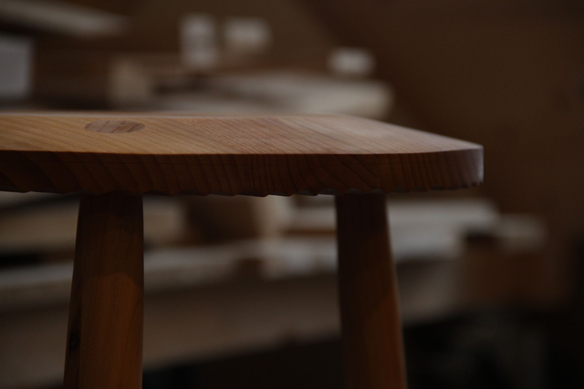 Tabouret en cèdre (d'autres essences sont possibles) avec assemblages traditionnels (tenons coniques). L'assise est travaillée au rabot et à la wastringue pour créer ce chanfrein tandis que le dessous est texturé à la gouge. Le tout est renforcé par une entretoise pour éviter l'écartement des pieds au fil des années.